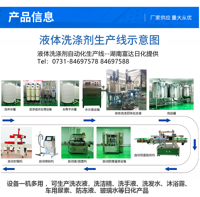 富達日化設備為我單位開發的洗化專用設備,有幾十種設備任您選擇,該設備直接接上電源后,不作任何安裝調試即可生產。設備精良,原料易購,設備采用優質不銹鋼精制而成。用于洗潔精、洗衣液、洗車液、玻璃水、車用尿素、洗衣粉、洗發水、沐浴露、防凍液、84消毒液等各種洗化用品的生產。