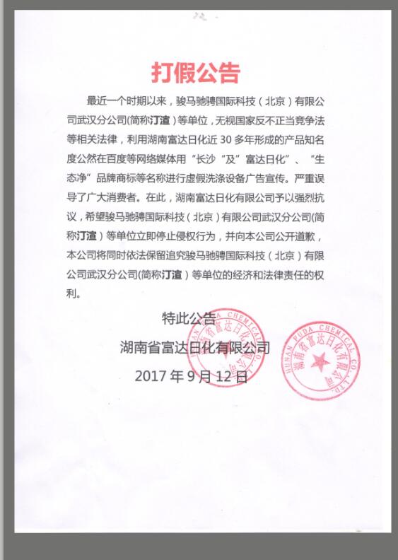 最近一個時期以來,以駿馬馳騁國際科技(北京)有限公司武漢分公司(簡稱汀渲)為代表等單位,無視國家反不正當競爭法等相關法律,利用湖南富達日化近30多年形成的產品知名度公然在百度等網絡媒體用“長沙“及”富達日化”、“生態凈”品牌商標等名稱進行虛假洗滌設備廣告宣傳。嚴重誤導了廣大消費者。在此,湖南富達日化有限公司予以強烈抗議,希望駿馬馳騁國際科技(北京)有限公司武漢分公司(簡稱汀渲)等單位立即停止侵權行為,并向本公司公開道歉,本公司將同時依法保留追究駿馬馳騁國際科技(北京)有限公司武漢分公司(簡稱汀渲)等單位的經濟和法律責任的權利。